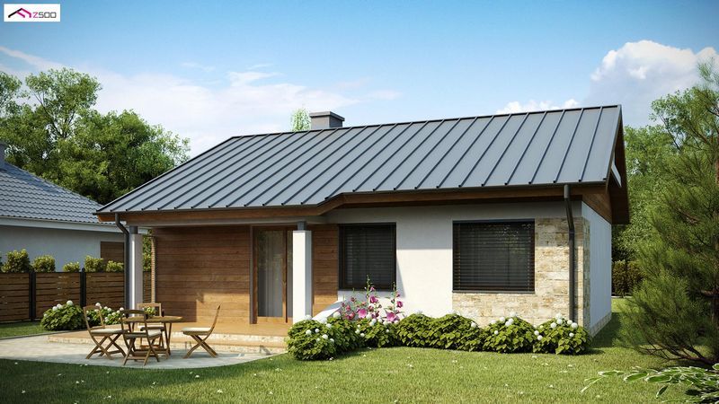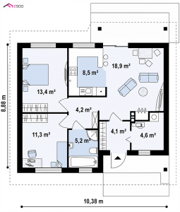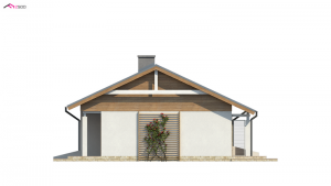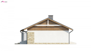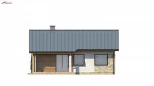 Niewielki dom parterowy z dachem dwuspadowym. Powierzchnia domu obejmuje dwa przestronne pokoje salon z aneksem kuchennym i jadalnią oraz łazienkę. Dom posiada też pomieszczenie gospodarcze – wejście z wiatrołapu które może pełnić funkcję kotłowni, spiżarni lub schowka