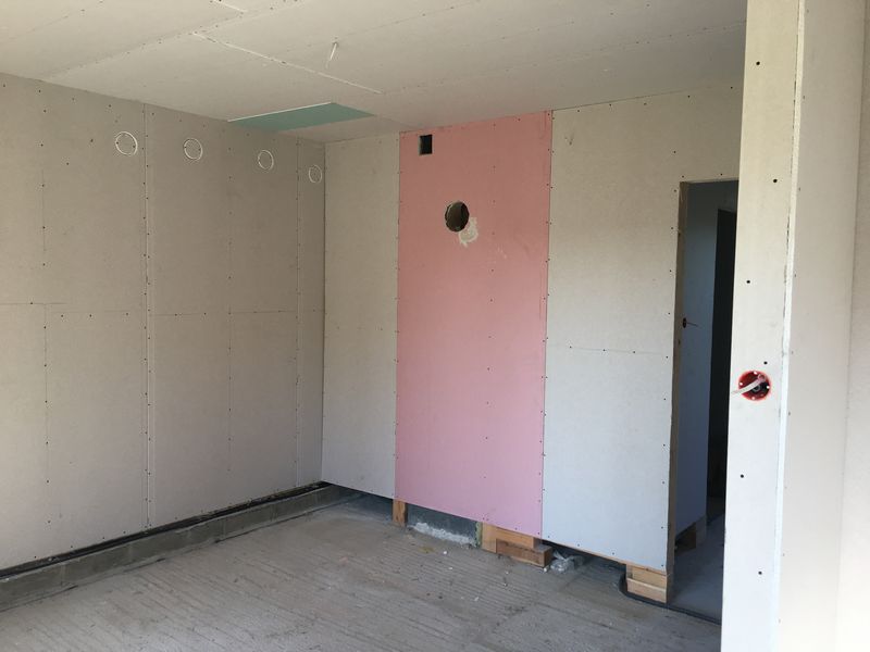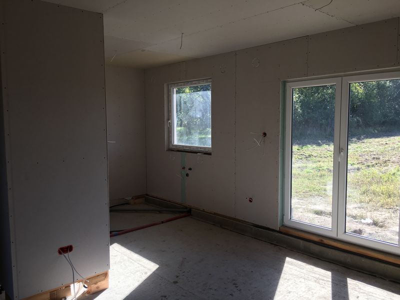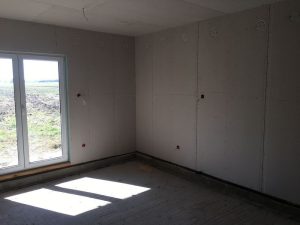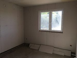• ocieplenie ścian zewnętrznych wełną celulozową 200 mm i wykończenie od wewnątrz płytą g-k