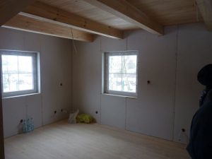 • ocieplenie ścian zewnętrznych wełną celulozową 200mm i wykończenie od wewnątrz płytą g-k