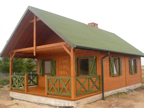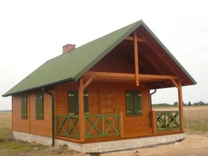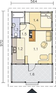 Mały i prosty domek letniskowy, w technologii szkieletowej, oferujący maksimum komfortu na minimalnej powierzchni. Serce domu stanowi kominek, wokół którego rozwiązano przestrzeń mieszkalną. Znajduje się tu pokój kominkowy, aneks kuchenny, łazienka i sypialnia. Atutem projektu jest wygodny zadaszony taras, umożliwiający korzystanie z uroków natury również w mniej sprzyjających warunkach pogodowych.